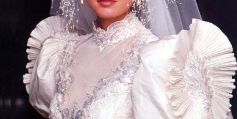 Wedding gowns became more elaborate than the years before. Luxury appears back again. Big shoulders, long straight siluette, laze and embroidery was really trendy.