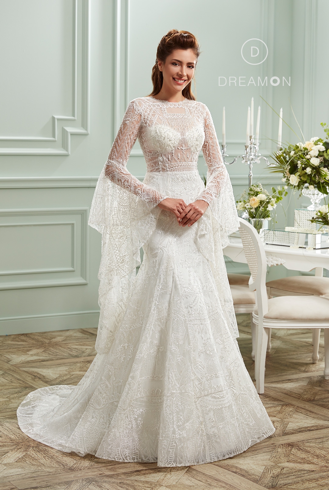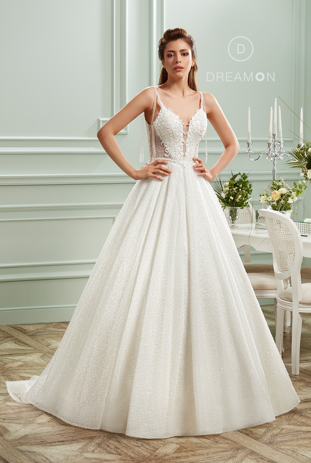 Style Esmeralda, which will be ideal for showy brides, will make you look thinner than you are with its body in different cuts, and it will ensure that nobody can take your eyes off your wedding with its pleated, shining and lace detailed skirt.