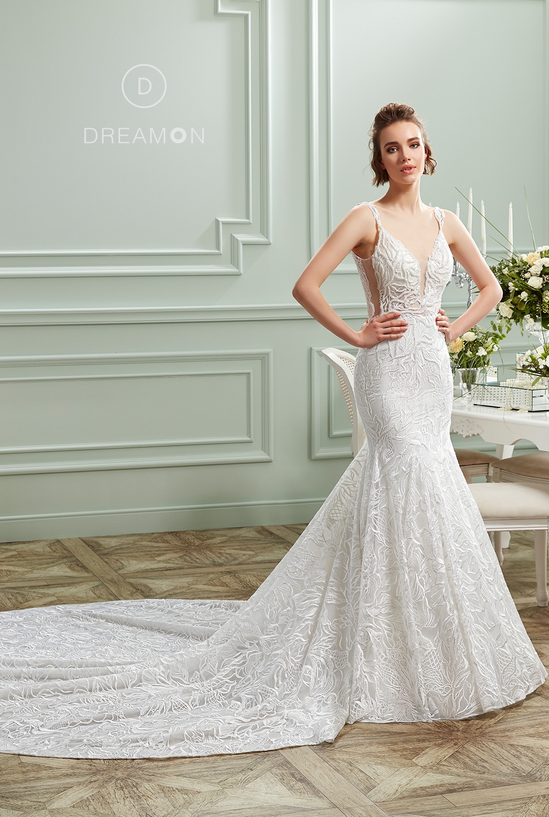 A tense mermaid wedding dress, in which the slim shoulder straps have a special fit with deep back and chest decors, with very intensive hand embroidery and special lace creating a richness to the sides of the skirt and in the tail. The scattered bun and a stylish veil will suit all wedding concepts.