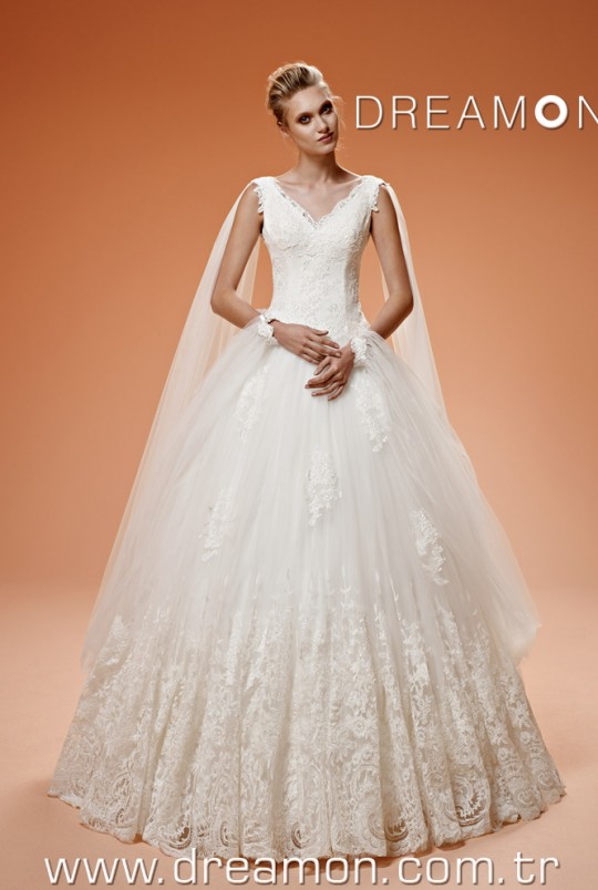 Fascinating design of bridal gown will live up to your dreamiest expectations. Consisting of v-neck, illusion sleeves and hand-crafted lace, is both stylish and very flashy.